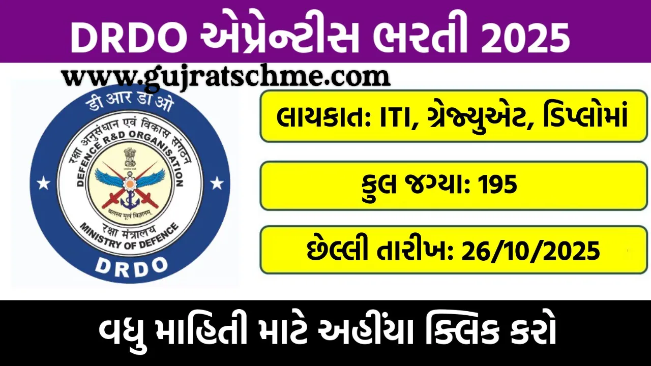 DRDO Apprentice Recruitment 2025: Graduate, Diploma અને ITI Trade માટે 195 ખાલી જગ્યાઓ, એક વર્ષની તાલીમ અને સરકારી સ્ટાઇપેન્ડ સાથે અરજી શરૂ