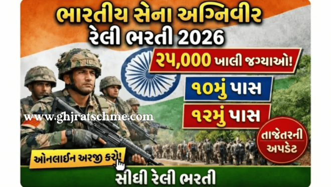 ભારત સરકાર દ્વારા વર્ષ 2026 માં અગ્નીપથ યોજના હેઠળ આશરે 25000 જેટલા જવાનોની ભરતી કરવામાં આવી સે અગ્નિવીર યોજનમાં કુલ 4 વર્ષ માટે જ્વાનની ભરતી કરવામાં આવે છે. આ ભરતીમાં જે પાસ થાય સે તે ઉમેદવાર ને સમાજ સન્માન પૂર્વક આદર ને સરકાર તરફથી નાણાકીય લાભો મળેછે.